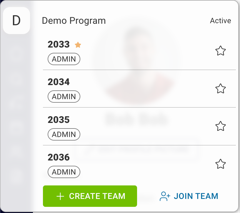 The Team Selector is your easy navigation point to toggle across different teams that you may be a member of. The teams are grouped by program and will display your user role.